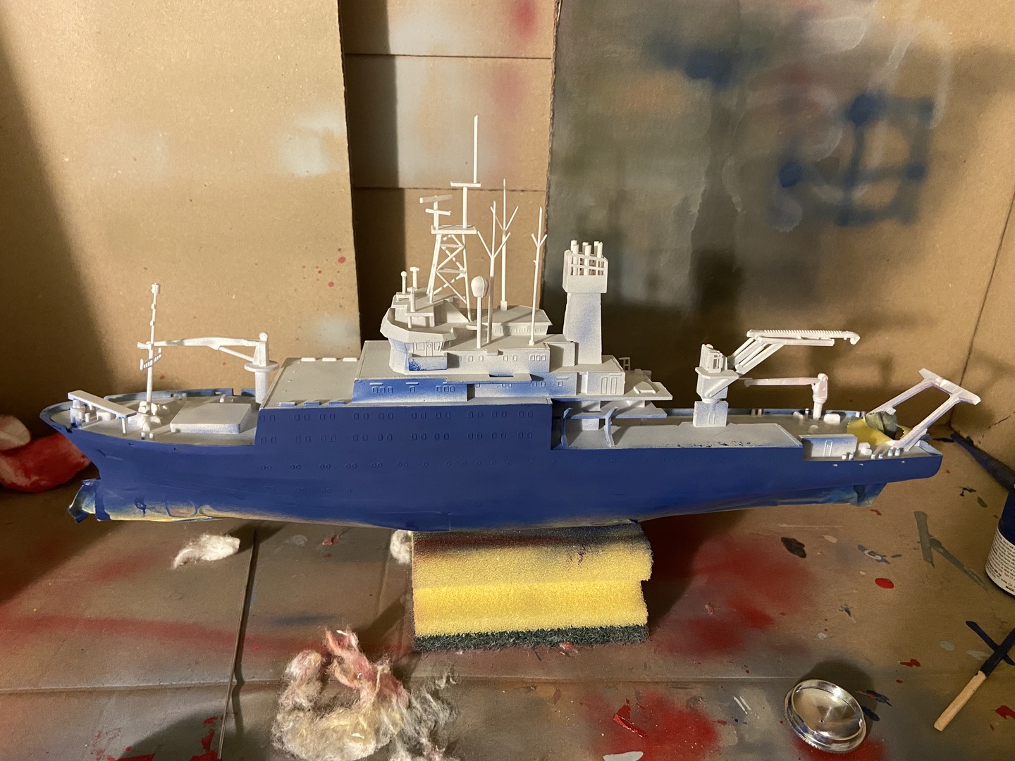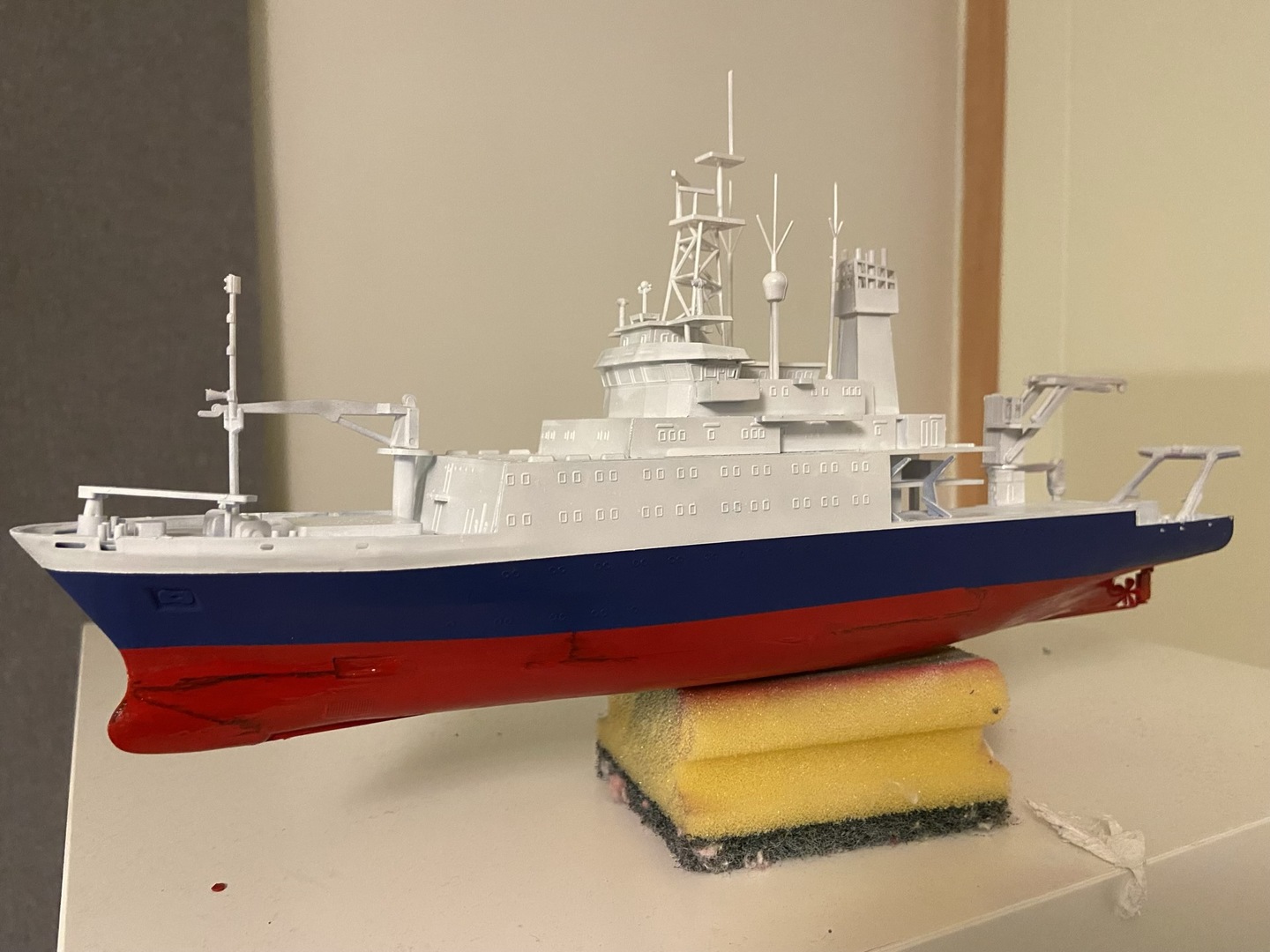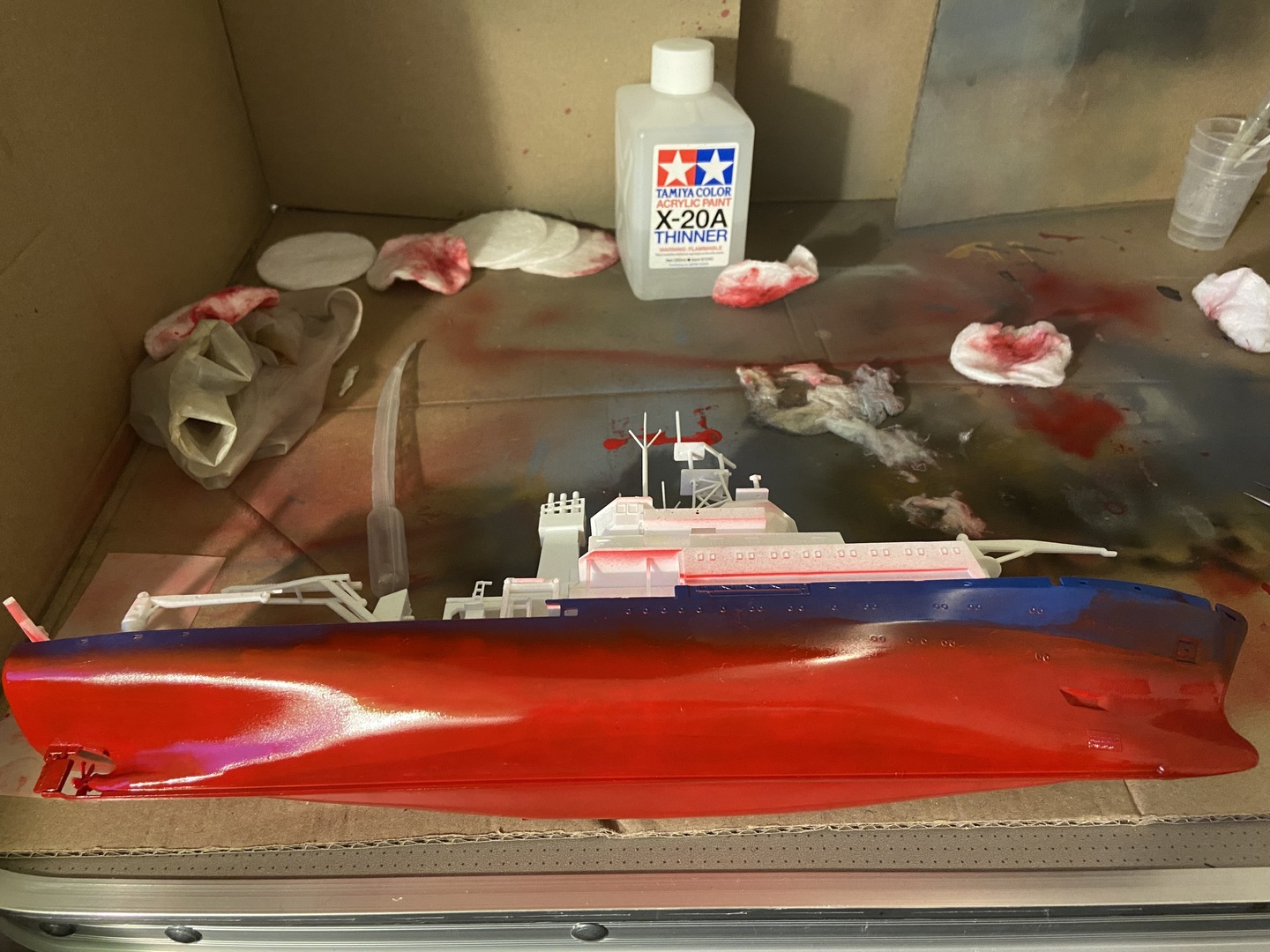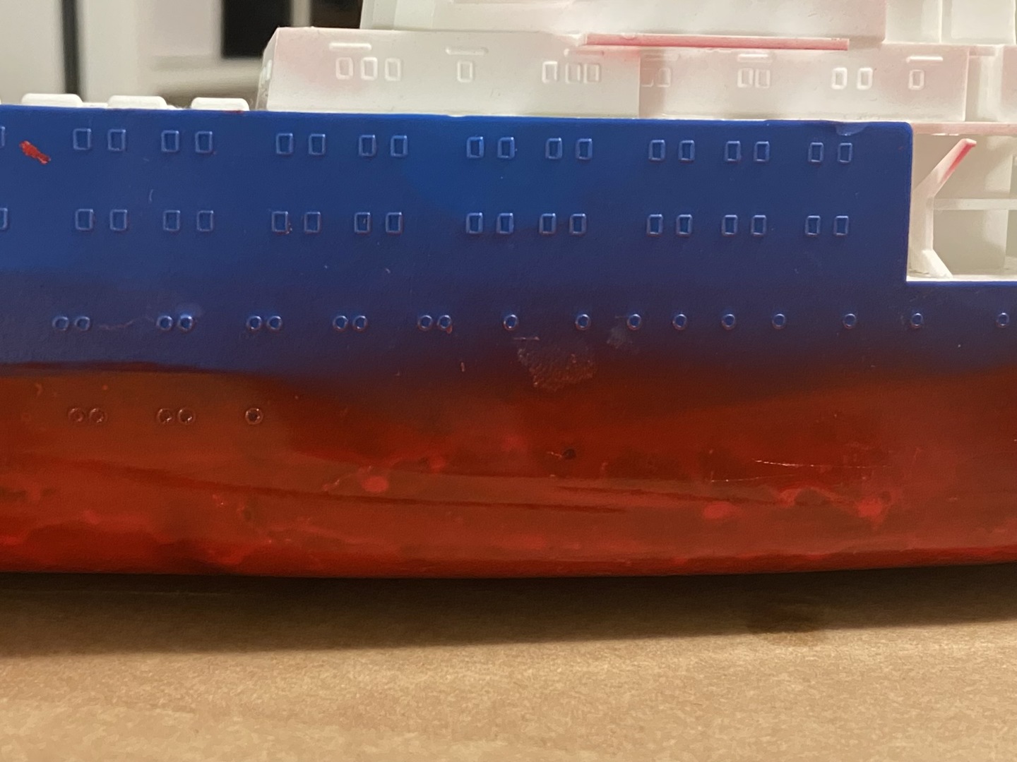 Ok, więc farba pokryła dobrze kadłub, zrobiłem jeden zaciek, ale go naprawiłem. Po dwóch warstwach zostawiłem model do wyschnięcia, do następnego dnia.